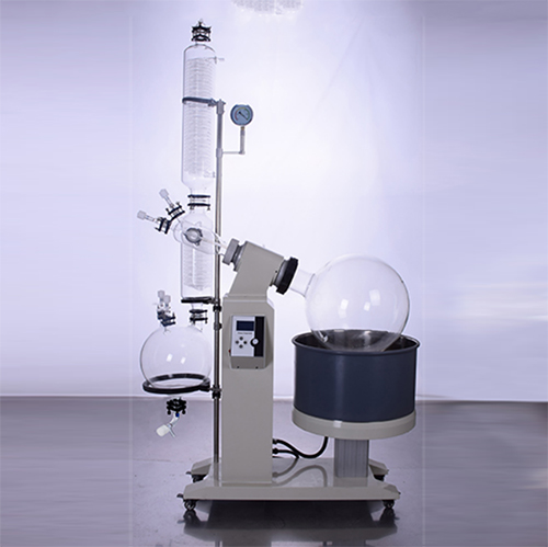 蒸(zhēng)發瓶恒速旋轉,水浴鍋(guō)恒溫加熱(rè),在此條件下:物料在蒸發瓶(píng)內壁形成大麵積均勻薄(báo)膜快速蒸發,在真空條件下可以提高蒸發效率(需連接真空裝置),溶媒(méi)蒸汽經玻璃冷凝盤管時冷卻成液體(tǐ)(需連接冷卻裝置),回收於收集瓶。