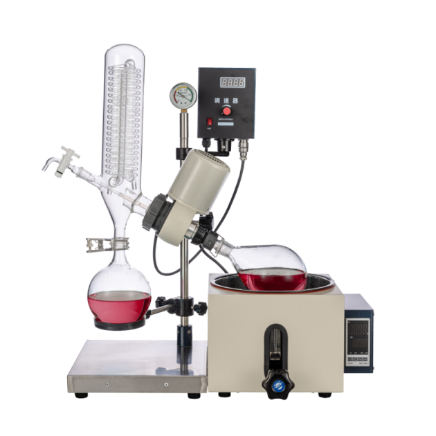 蒸發瓶恒速旋轉,水浴鍋恒溫加熱,在此(cǐ)條件下:物料在蒸發瓶內壁(bì)形(xíng)成大麵積均勻薄膜快速蒸發,在真空條件下可以提高蒸發效(xiào)率(需連(lián)接真空裝置),溶(róng)媒(méi)蒸汽經(jīng)玻璃冷凝盤管時冷卻成液體(需連(lián)接冷卻裝(zhuāng)置),回收於收集瓶(píng)。