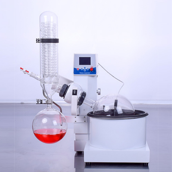 蒸發瓶恒速旋轉,水浴鍋恒溫加熱,在此(cǐ)條件下:物料在蒸發瓶內壁形成大麵積均(jun1)勻薄膜快速蒸發,在真空條件下可以提高蒸發效率(需連接真(zhēn)空裝置),溶媒蒸汽經玻璃冷凝盤管(guǎn)時冷卻成液體(需(xū)連接冷卻裝置),回收於收集瓶。